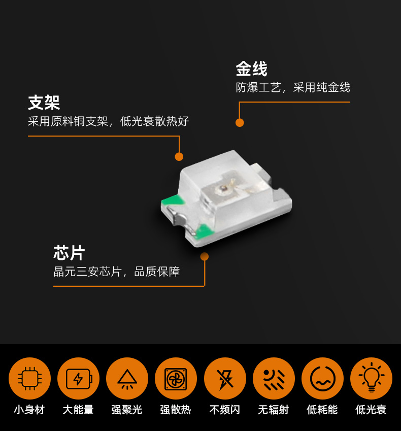 公司的產品種類齊全,主要有各種規格/亮度的(紅、黃、綠、橙、藍、白、紫、粉紅色)LED發光二極管,雙色、全彩、七彩LED,背光專用LED,顯示屏專用LED,紅外發射管、紅外接收頭、光敏管、貼片LED;有直插、貼片、食人魚、大功率等封裝形式,另外還可以根據客戶要求開發特殊型號的LED產品。產品質量和技術指標均達到國際通行標準并通過了ROHS環保檢測。廣泛應用于各類家電、數碼、通信、汽車電子、照明燈飾、電子玩具、交通指示、城市亮化工程等相關生產企業。