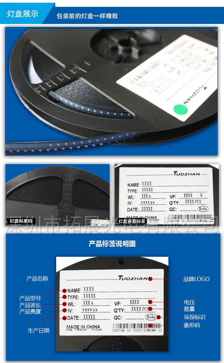 2、上述產品效果圖片是在藍色背景下拍攝只供參考,一切產品以本公司3528藍光光源產品實物為準。