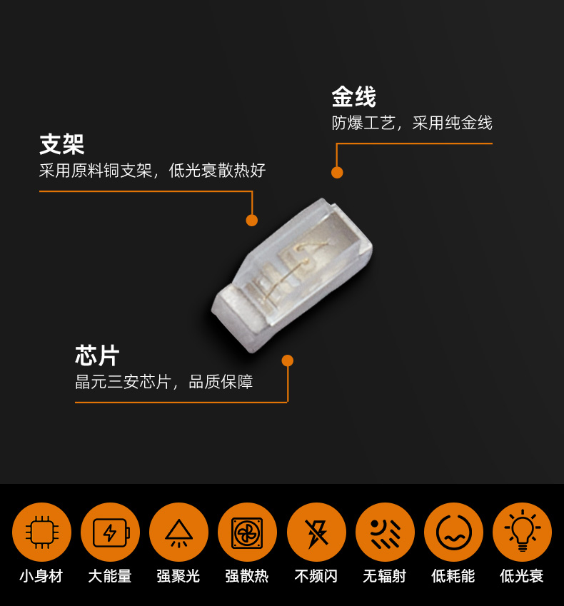 1、本公司采用臺灣全自動固晶機,焊線機,保證產品的一致性,全系產品采用臺灣芯片,耐高溫環氧樹脂膠水,純金線制成,保證了產品的穩定性