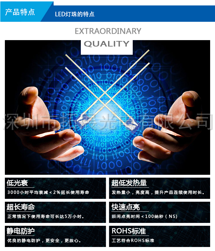 公司的產品種類齊全,主要有各種規格/亮度的(紅、黃、綠、橙、藍、白、紫、粉紅色)LED發光二極管,雙色、全彩、七彩LED,背光專用LED,顯示屏專用LED,紅外發射管、紅外接收頭、光敏管、貼片LED;有直插、貼片、食人魚、大功率等封裝形式,另外還可以根據客戶要求開發特殊型號的LED產品。產品質量和技術指標均達到國際通行標準并通過了ROHS環保檢測。廣泛應用于各類家電、數碼、通信、汽車電子、照明燈飾、電子玩具、交通指示、城市亮化工程等相關生產企業。