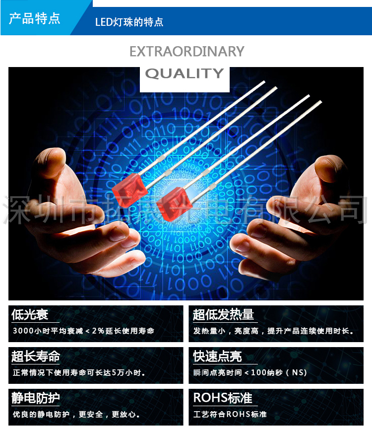 公司的產品種類齊全,主要有各種規格/亮度的(紅、黃、綠、橙、藍、白、紫、粉紅色)LED發光二極管,雙色、全彩、七彩LED,背光專用LED,顯示屏專用LED,紅外發射管、紅外接收頭、光敏管、貼片LED;有直插、貼片、食人魚、大功率等封裝形式,另外還可以根據客戶要求開發特殊型號的LED產品。產品質量和技術指標均達到國際通行標準并通過了ROHS環保檢測。廣泛應用于各類家電、數碼、通信、汽車電子、照明燈飾、電子玩具、交通指示、城市亮化工程等相關生產企業。