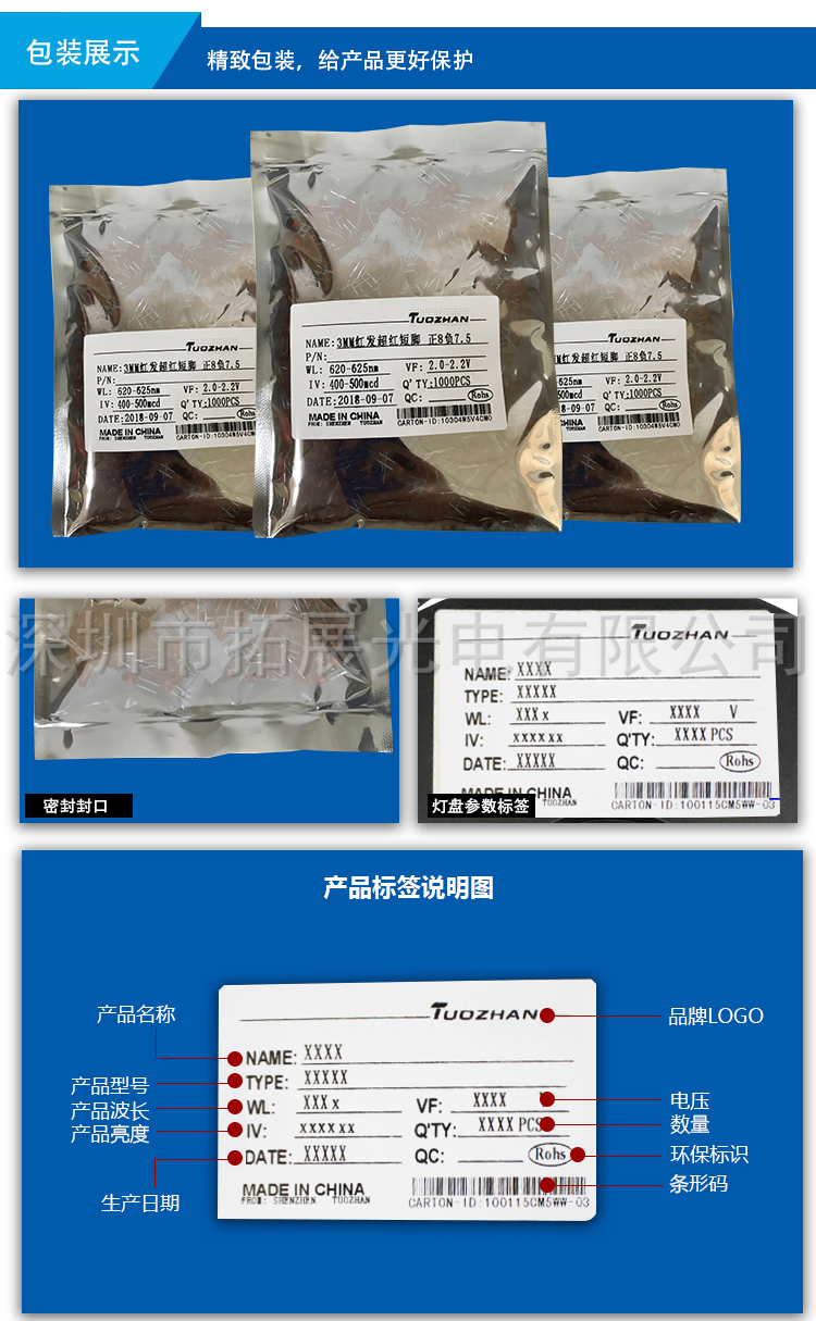 LED 的包裝是用防潮的鋁包裝袋包裝,并且包裝袋里面含有干燥劑主要起到控制包裝袋里的濕度.