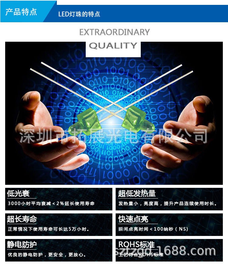 本公司采用臺灣全自動固晶機(jī)、焊線機(jī),保證產(chǎn)品的一致性,全系產(chǎn)品采用臺灣芯片,耐高溫環(huán)氧樹脂膠水,純金線制成,保證了產(chǎn)品的穩(wěn)定性。 2、公司產(chǎn)品全系列通過了ROHS Reach EN62471(EN60825)認(rèn)證!公司一般納稅人企業(yè),可開17%增值發(fā)票。 客戶利益 1、產(chǎn)品一致性好,亮度高,質(zhì)量穩(wěn)定解決客戶對產(chǎn)品質(zhì)量的憂慮;, 2、每天2000K-3000K的產(chǎn)量,保證交期快捷; 3、同等質(zhì)量,價(jià)格優(yōu)惠!強(qiáng)大的銷售團(tuán)隊(duì),給客戶至高無上的服務(wù)!