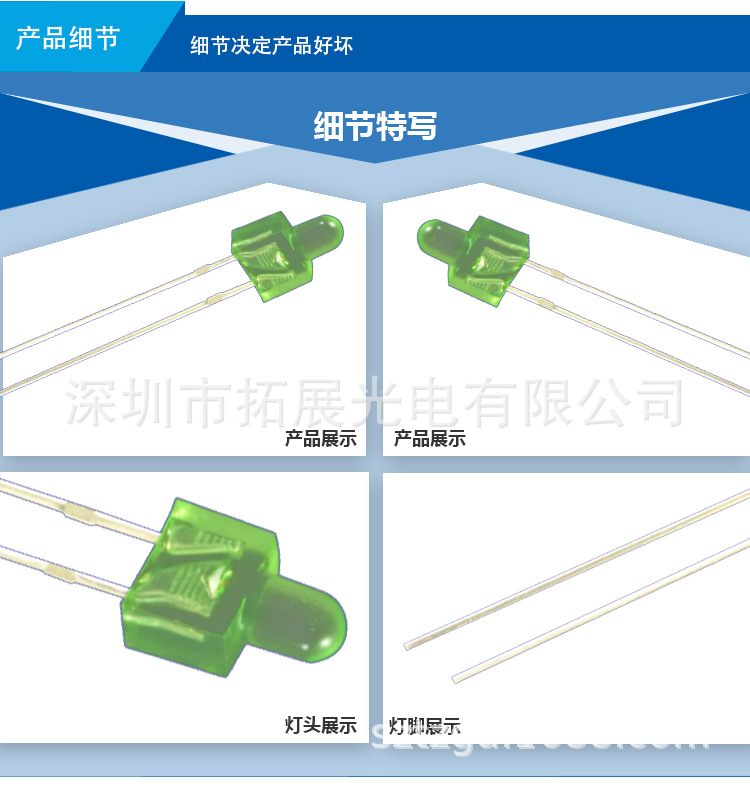 公司的產(chǎn)品種類齊全,主要有各種規(guī)格/亮度的(紅、黃、綠、橙、藍(lán)、白、紫、粉紅色)LED發(fā)光二極管,雙色、全彩、七彩LED,背光專用LED,顯示屏專用LED,紅外發(fā)射管、紅外接收頭、光敏管、貼片LED;有直插、貼片、食人魚、大功率等封裝形式,另外還可以根據(jù)客戶要求開發(fā)特殊型號的LED產(chǎn)品。產(chǎn)品質(zhì)量和技術(shù)指標(biāo)均達(dá)到國際通行標(biāo)準(zhǔn)并通過了ROHS環(huán)保檢測。廣泛應(yīng)用于各類家電、數(shù)碼、通信、汽車電子、照明燈飾、電子玩具、交通指示、城市亮化工程等相關(guān)生產(chǎn)企業(yè)。