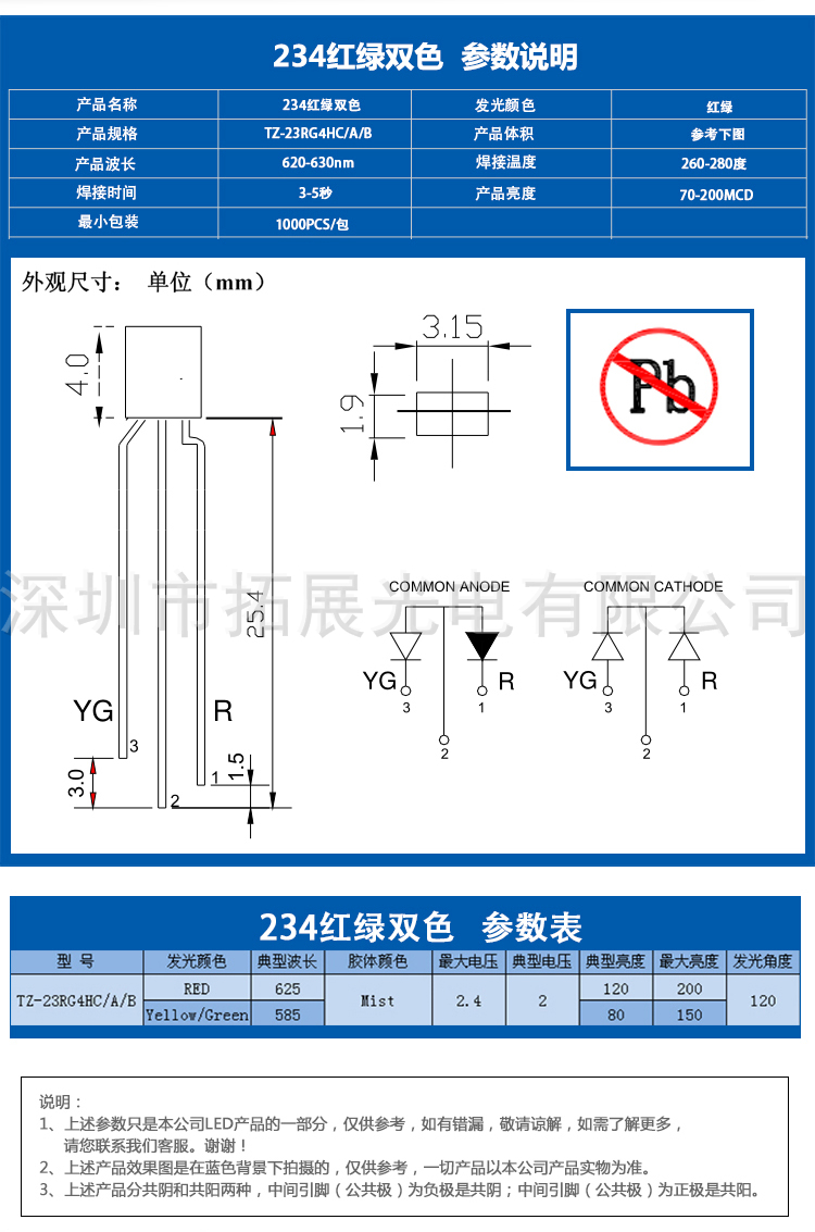 234霧狀紅綠雙色led產品參數: