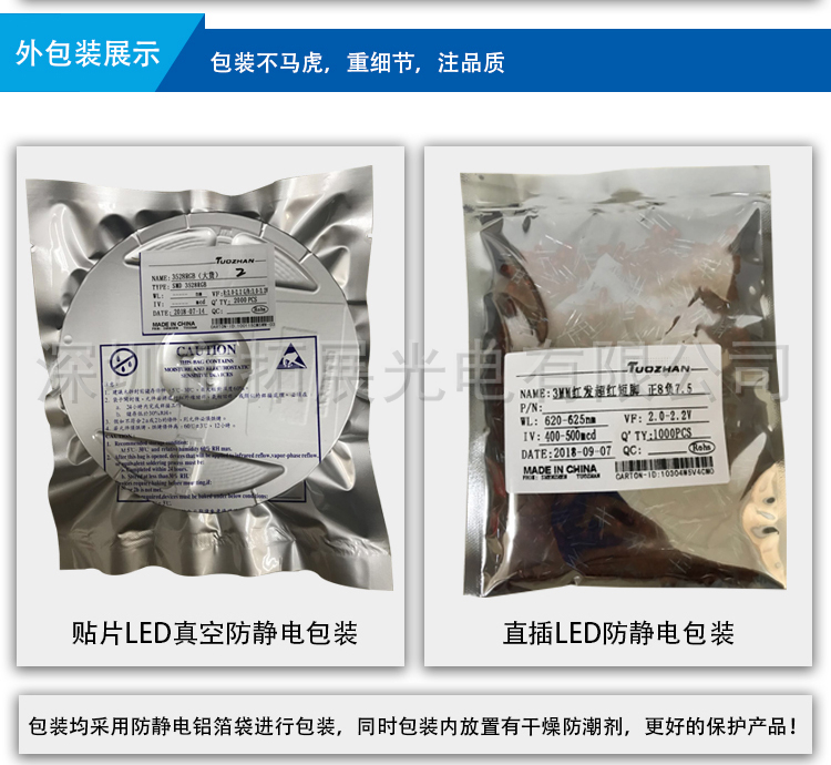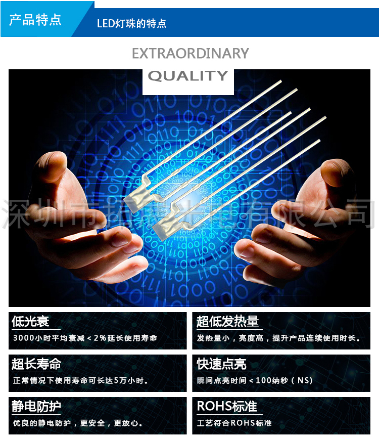 公司的產品種類齊全,主要有各種規格/亮度的(紅、黃、綠、橙、藍、白、紫、粉紅色)LED發光二極管,雙色、全彩、七彩LED,背光專用LED,顯示屏專用LED,紅外發射管、紅外接收頭、光敏管、貼片LED;有直插、貼片、食人魚、大功率等封裝形式,另外還可以根據客戶要求開發特殊型號的LED產品。產品質量和技術指標均達到國際通行標準并通過了ROHS環保檢測。廣泛應用于各類家電、數碼、通信、汽車電子、照明燈飾、電子玩具、交通指示、城市亮化工程等相關生產企業。