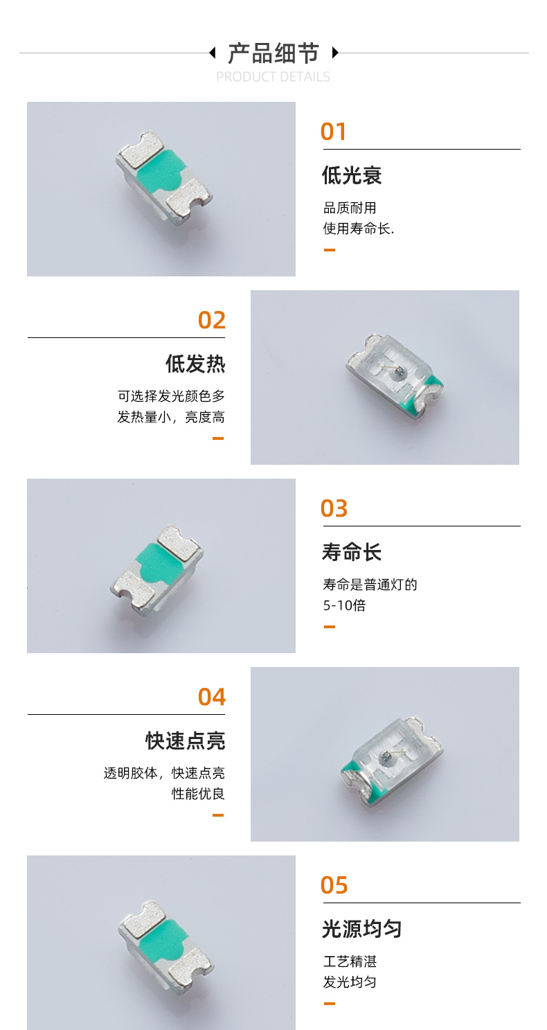 公司的產品種類齊全,主要有各種規格/亮度的(紅、黃、綠、橙、藍、白、紫、粉紅色)LED發光二極管,雙色、全彩、七彩LED,背光專用LED,顯示屏專用LED,紅外發射管、紅外接收頭、光敏管、貼片LED;有直插、貼片、食人魚、大功率等封裝形式,另外還可以根據客戶要求開發特殊型號的LED產品。產品質量和技術指標均達到國際通行標準并通過了ROHS環保檢測。廣泛應用于各類家電、數碼、通信、汽車電子、照明燈飾、電子玩具、交通指示、城市亮化工程等相關生產企業。