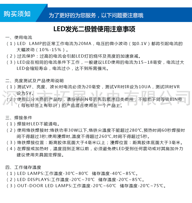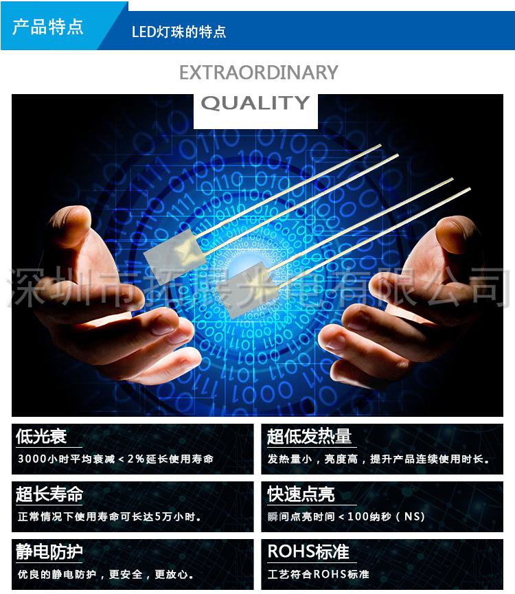 公司的產品種類齊全,主要有各種規格/亮度的(紅、黃、綠、橙、藍、白、紫、粉紅色)LED發光二極管,雙色、全彩、七彩LED,背光專用LED,顯示屏專用LED,紅外發射管、紅外接收頭、光敏管、貼片LED;有直插、貼片、食人魚、大功率等封裝形式,另外還可以根據客戶要求開發特殊型號的LED產品。產品質量和技術指標均達到國際通行標準并通過了ROHS環保檢測。廣泛應用于各類家電、數碼、通信、汽車電子、照明燈飾、電子玩具、交通指示、城市亮化工程等相關生產企業。