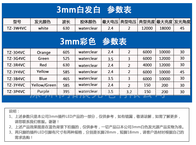 公司的產品種類齊全,主要有各種規格/亮度的(紅、黃、綠、橙、藍、白、紫、粉紅色)LED發光二極管,雙色、全彩、七彩LED,背光專用LED,顯示屏專用LED,紅外發射管、紅外接收頭、光敏管、貼片LED;有直插、貼片、食人魚、大功率等封裝形式,另外還可以根據客戶要求開發特殊型號的LED產品。產品質量和技術指標均達到國際通行標準并通過了ROHS環保檢測。廣泛應用于各類家電、數碼、通信、汽車電子、照明燈飾、電子玩具、交通指示、城市亮化工程等相關生產企業。