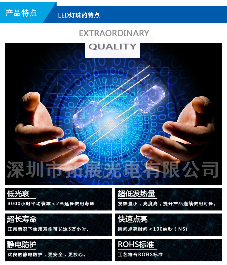 深圳市拓展光電有限公司是一家專業從事各種中、高檔LED發光二極管的研發、生產、銷售與服務的科技型企業。