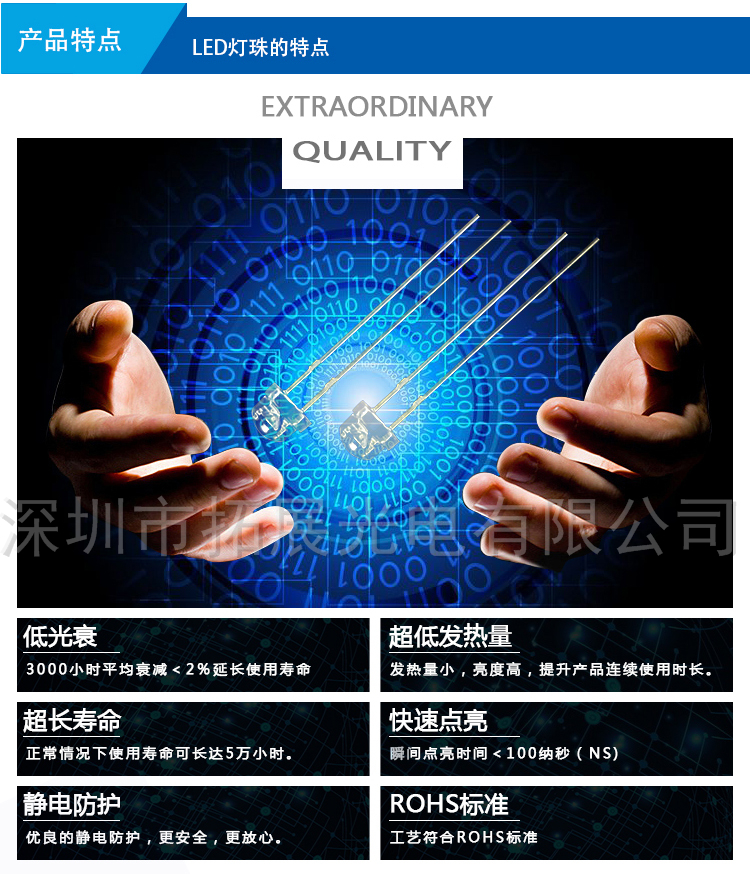 公司的產品種類齊全,主要有各種規格/亮度的(紅、黃、綠、橙、藍、白、紫、粉紅色)LED發光二極管,雙色、全彩、七彩LED,背光專用LED,顯示屏專用LED,紅外發射管、紅外接收頭、光敏管、貼片LED;有直插、貼片、食人魚、大功率等封裝形式,另外還可以根據客戶要求開發特殊型號的LED產品。產品質量和技術指標均達到國際通行標準并通過了ROHS環保檢測。廣泛應用于各類家電、數碼、通信、汽車電子、照明燈飾、電子玩具、交通指示、城市亮化工程等相關生產企業。