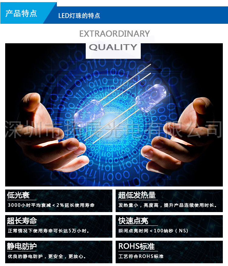 公司的產品種類齊全,主要有各種規格/亮度的(紅、黃、綠、橙、藍、白、紫、粉紅色)LED發光二極管,雙色、全彩、七彩LED,背光專用LED,顯示屏專用LED,紅外發射管、紅外接收頭、光敏管、貼片LED;有直插、貼片、食人魚、大功率等封裝形式,另外還可以根據客戶要求開發特殊型號的LED產品。產品質量和技術指標均達到國際通行標準并通過了ROHS環保檢測。廣泛應用于各類家電、數碼、通信、汽車電子、照明燈飾、電子玩具、交通指示、城市亮化工程等相關生產企業。