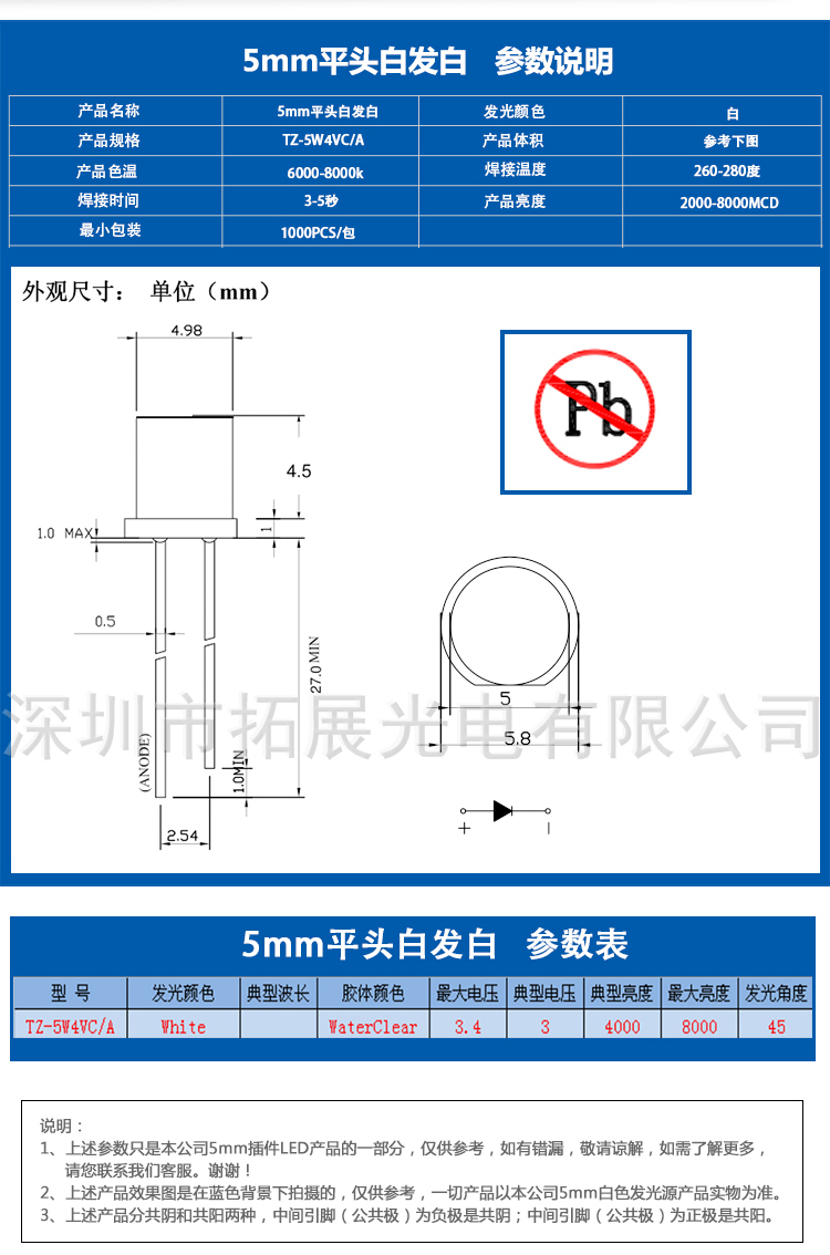 立即咨詢TZ-L2-05PYBW2TDJ60-001,TUOZHAN(拓展光電)5mm平頭暖白光,F5平頭白