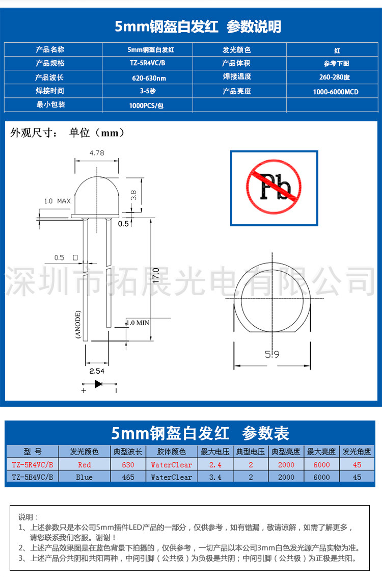 立即咨詢TZ-220210053,TUOZHAN(拓展光電)5mm鋼盔白發紅led直插燈珠,F5紅燈