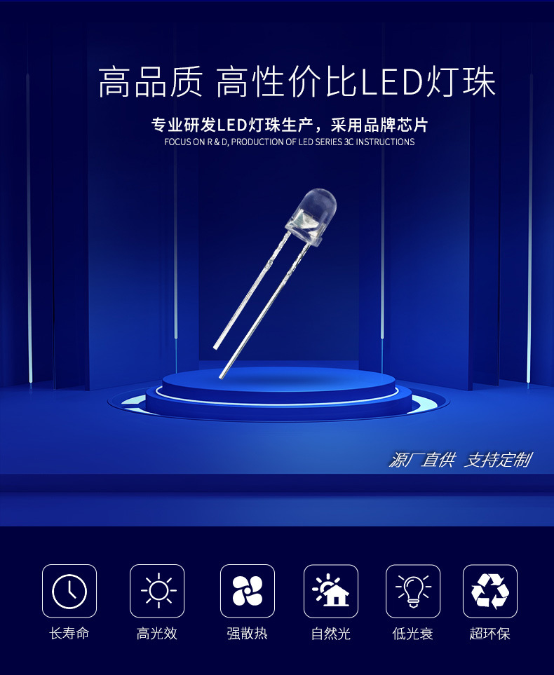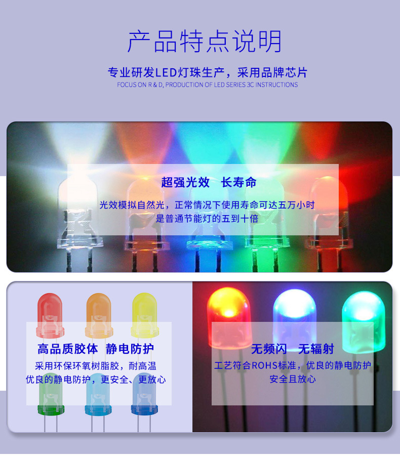 F4直插燈珠圓頭長(zhǎng)腳白發(fā)紅/藍(lán)/黃/白/多色4mm高亮LED