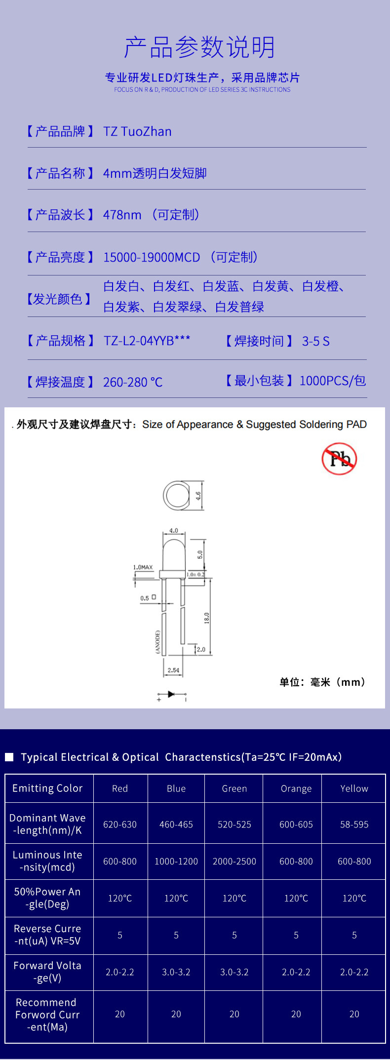 立即咨詢TZ-L2-04YYBW4TDJ30-001,TUOZHAN(拓展光電)F4直插燈珠,高亮LED
